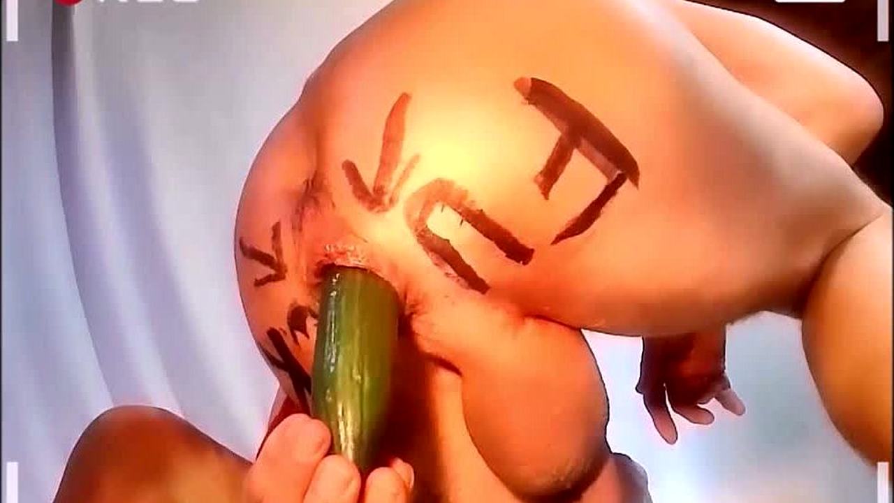 Pathetic slave stretches gay ass with cucumber and brush in cmnm humiliation.